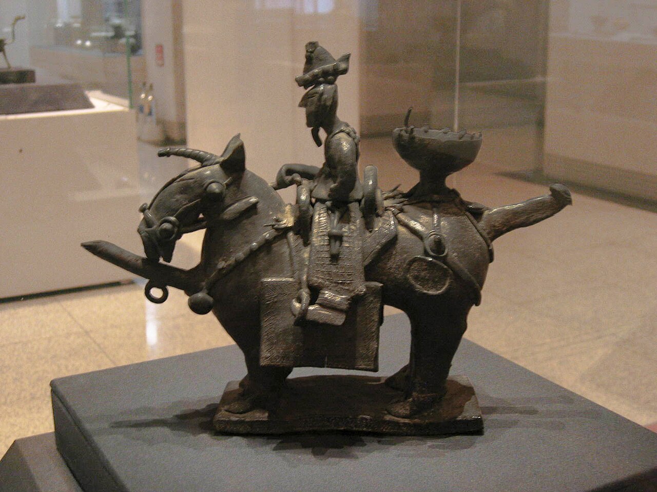 I vasai Tang producevano le ceramiche “tre colori”, sia come pezzi di vasellame (sancai) sia come statuette funerarie (yong) le cui decorazioni erano policrome: il giallo era ricavato dall’ossido di ferro, il verde era dato dall’ossido di rame, il viola dal manganese. Venne poi introdotto il blu ottenuto dall’ossido di cobalto che proveniva dal Medio Oriente e trasportato lungo le nuove rotte commerciali che attraversavano l’Asia centrale.