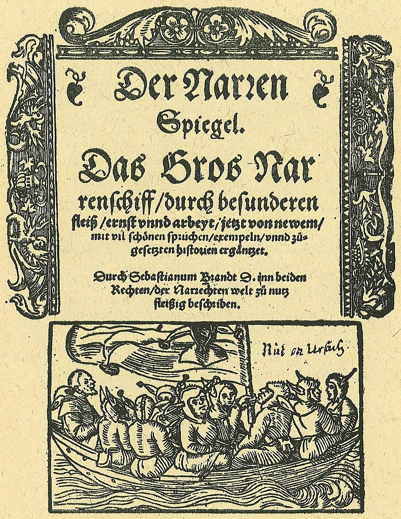 “La Nave dei folli” è un componimento satirico di Sebastian Brant, scritto in tedesco alsaziano, arricchito da xilografie, molte delle quali attribuite ad Albrecht Dürer, venne pubblicato a Basilea nel 1494. Attraverso la figura allegorica della “nave dei folli”, l’autore critica aspramente la società dell’epoca in preda ai vizi e alle debolezze. Il libro ottenne in breve tempo una grandissima popolarità, nonostante l’elevato tasso di analfabetismo dell’epoca.